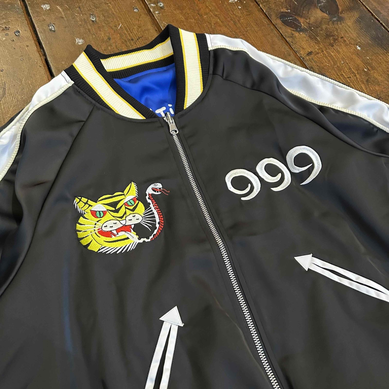日々オリジナルのモンスターを生み出し続けるアーティスト・TOMASON氏の人気キャラクター"チワワギャング"などが両面に刺繍されたスカジャンです。